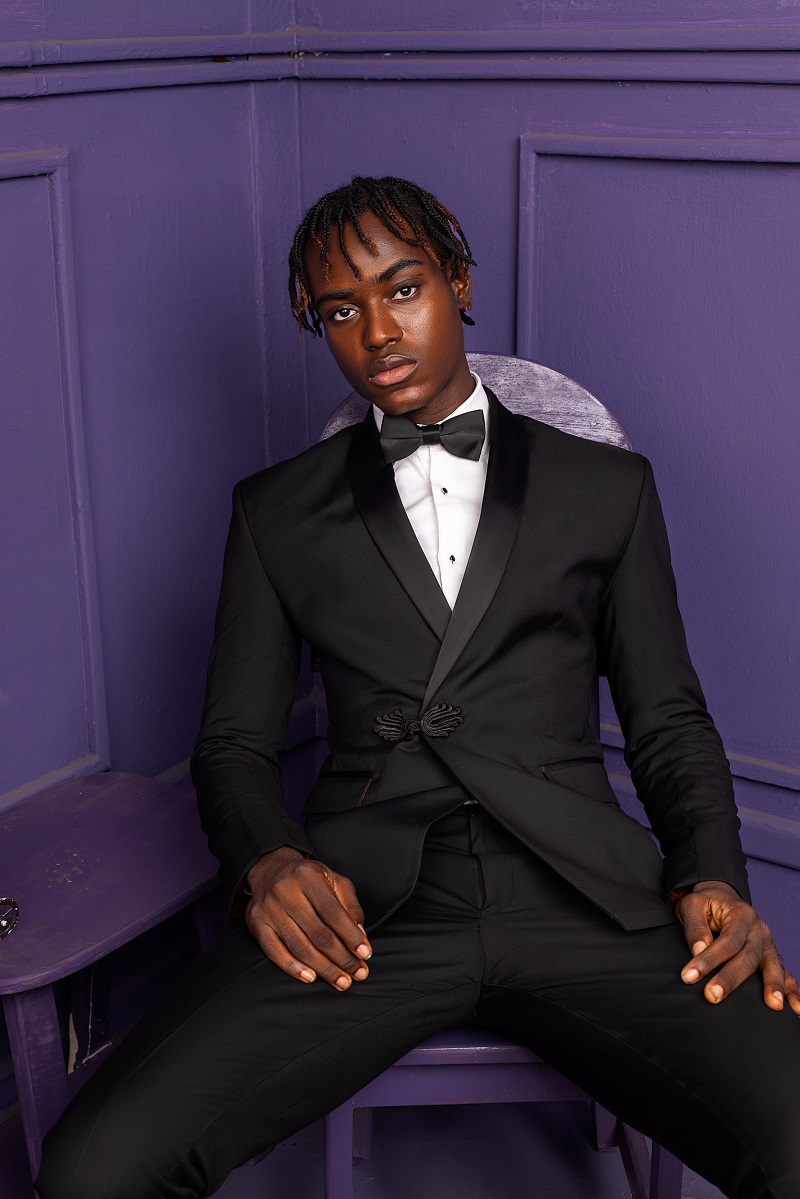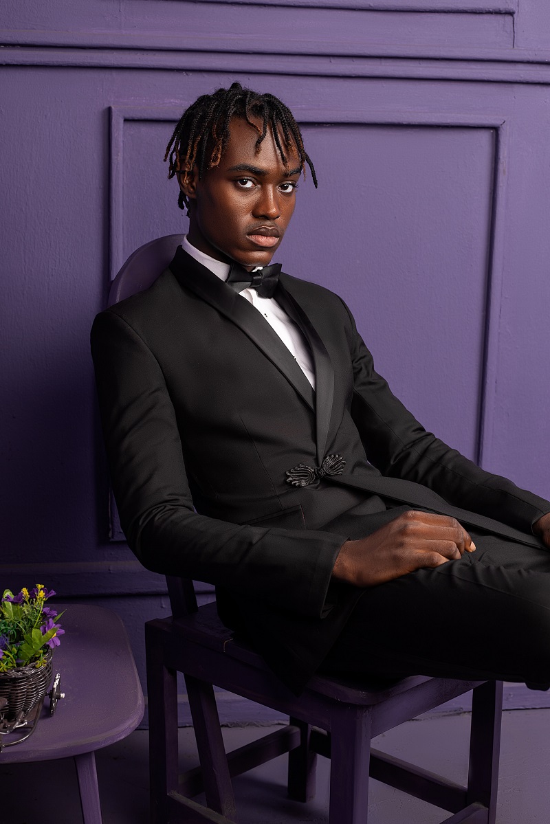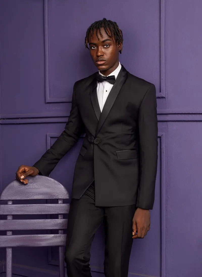 A Black single button, double-breasted tuxedo jacket with shawl lapel and Chinese buttons, paired w/ black tuxedo pants Items: Tuxedo jacket Pant trousers Other items (priced separately) Shirt Accessories Shipping policies: We ship worldwide General order processing time takes 2 to 4 weeks (a new garment is produced from scratch for each customer) Orders within Lagos: 2 to 3 weeks Interstate orders: 2 to 3 weeks International orders: 3 to 4 weeks Once ordered, you will be contacted by a representative to arrange delivery date and any other detail Customers pay the cost of shipping and custom duties Care: Dry-clean only For other items, inquiries or Urgent orders; Text/ WhatsApp/ Call: +2348122365137 Or Email: hello@ro-gue.com Web: www.rogue.ng Instagram/Tiktok/Facebook/Twitter (@rogue_ng)