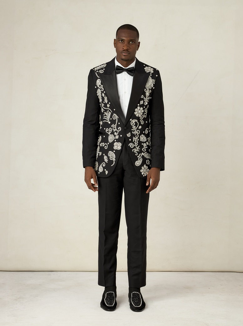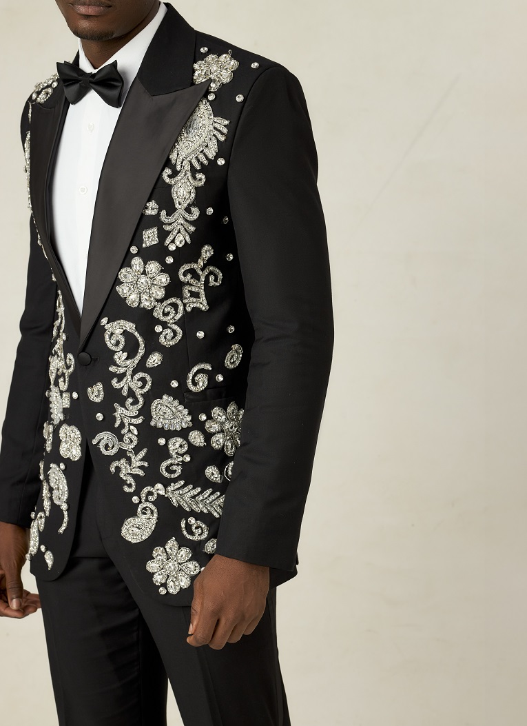 A Black wool peak lapel tuxedo suit detailed with ornamental crystal rhinestones Items: embellished tuxedo jacket embellished tux pants Other items (priced separately) Shirt bowtie Shipping policies: We ship worldwide General order processing time takes 3 to 5 weeks (a new garment is produced from scratch for each customer) Orders within Lagos: 3 to 4 weeks Interstate orders: 3 to 4 weeks International orders: 4 to 5 weeks Once ordered, you will be contacted by a representative to arrange delivery date and any other detail Customers pay the cost of shipping and custom duties Care: Dry-clean only For other items, inquiries or Urgent orders; Text/ WhatsApp/ Call: +2348122365137 Or Email: hello@ro-gue.com Web: www.rogue.ng Instagram/Tiktok/Facebook/Twitter (@rogue_ng)