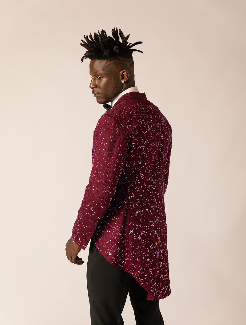 Burgundy Studded Damask Peak lapel Longtail Suit