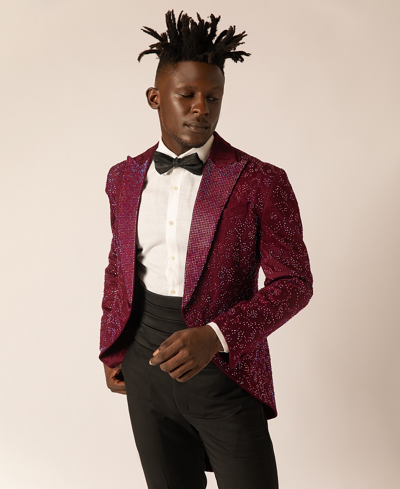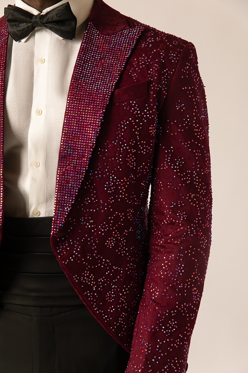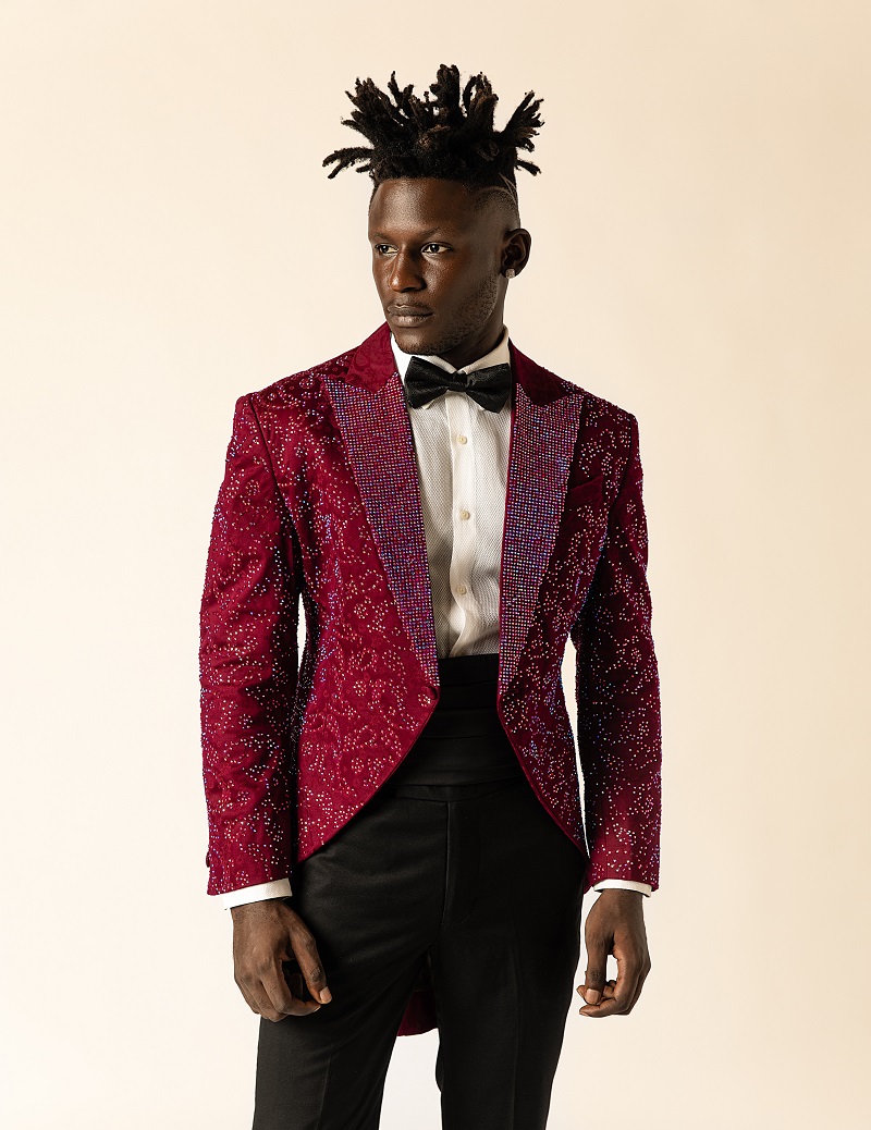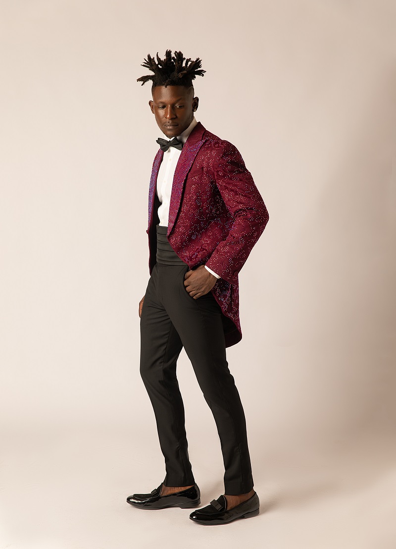 A Rhinestone Embellished Burgundy Damask Peak lapel Longtail Suit w/ Black wool pants Items: Suit jacket Pant trousers Other items (priced separately) Shirt Accessories Shipping policies: We ship worldwide General order processing time takes 2 to 4 weeks (a new garment is produced from scratch for each customer) Orders within Lagos: 2 to 3 weeks Interstate orders: 2 to 3 weeks International orders: 3 to 4 weeks Once ordered, you will be contacted by a representative to arrange delivery date and any other detail Customers pay the cost of shipping and custom duties Care: Dry-clean only For other items, inquiries or Urgent orders; Text/ WhatsApp/ Call: +2348122365137 Or Email: hello@ro-gue.com Web: www.rogue.ng Instagram/Tiktok/Facebook/Twitter (@rogue_ng)