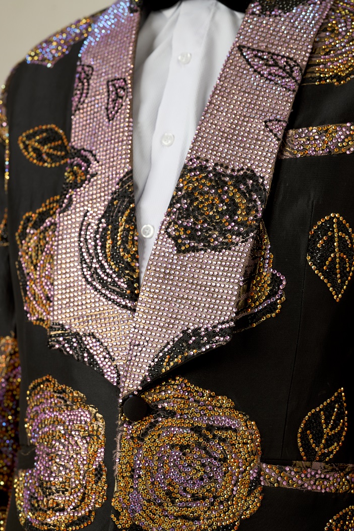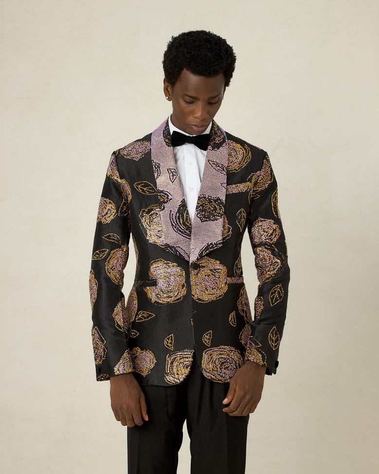 Embellished black floral print jacquard shawl lapel tuxedo suit
