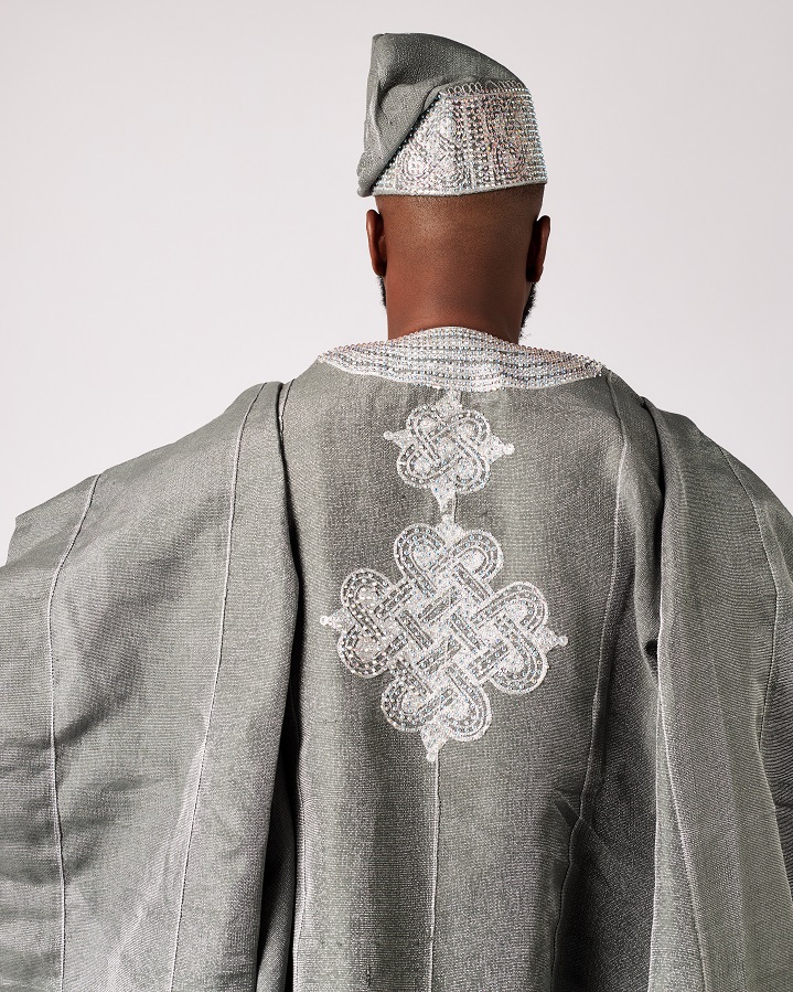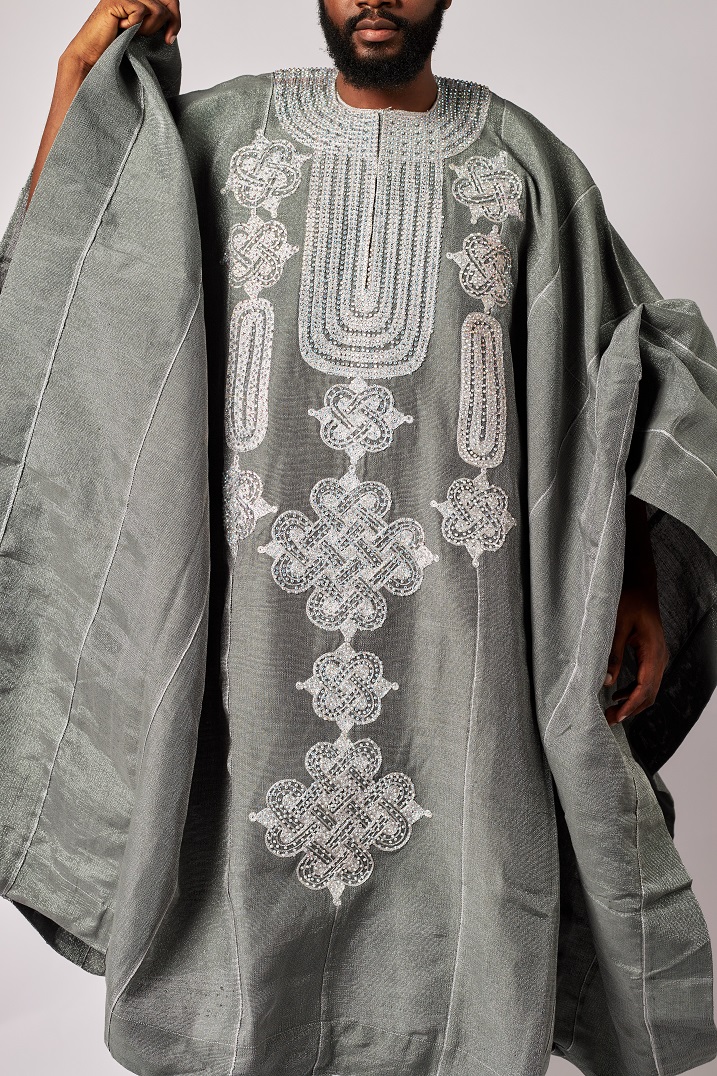 Grey Asooke Three-piece Agbada embellished with Rhinestones