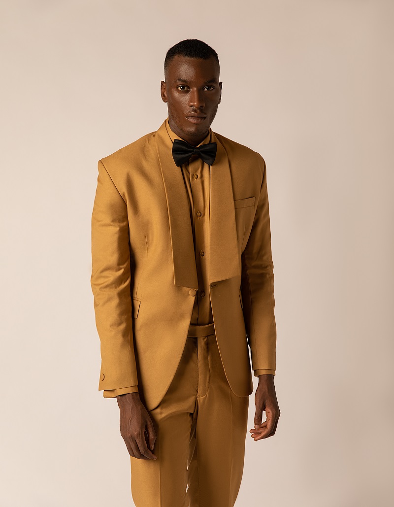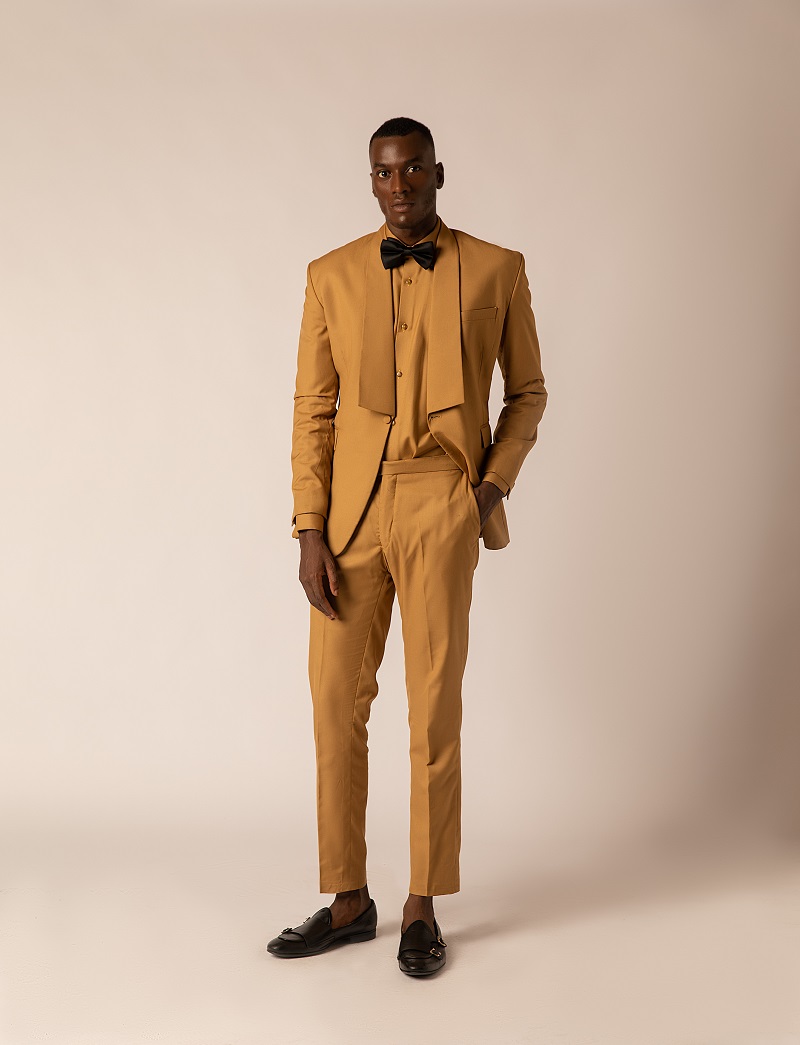 A Mustard Brown Wool Three-piece Shawl lapel Tuxedo w/ matching wool shirt and pants Items: Suit jacket Pant trousers Shirt Other items (priced separately) Accessories Shipping policies: We ship worldwide General order processing time takes 2 to 4 weeks (a new garment is produced from scratch for each customer) Orders within Lagos: 2 to 3 weeks Interstate orders: 2 to 3 weeks International orders: 3 to 4 weeks Once ordered, you will be contacted by a representative to arrange delivery date and any other detail Customers pay the cost of shipping and custom duties Care: Dry-clean only For other items, inquiries or Urgent orders; Text/ WhatsApp/ Call: +2348122365137 Or Email: hello@ro-gue.com Web: www.rogue.ng Instagram/Tiktok/Facebook/Twitter (@rogue_ng)