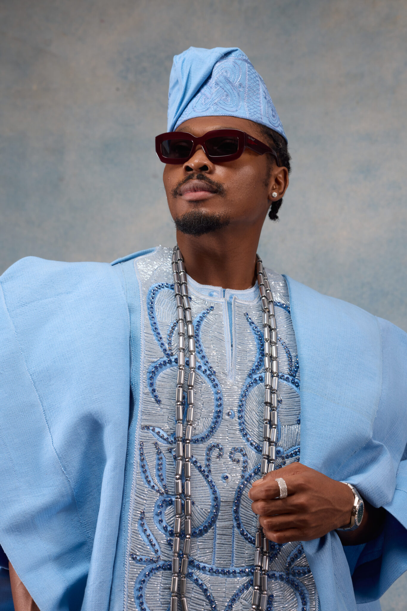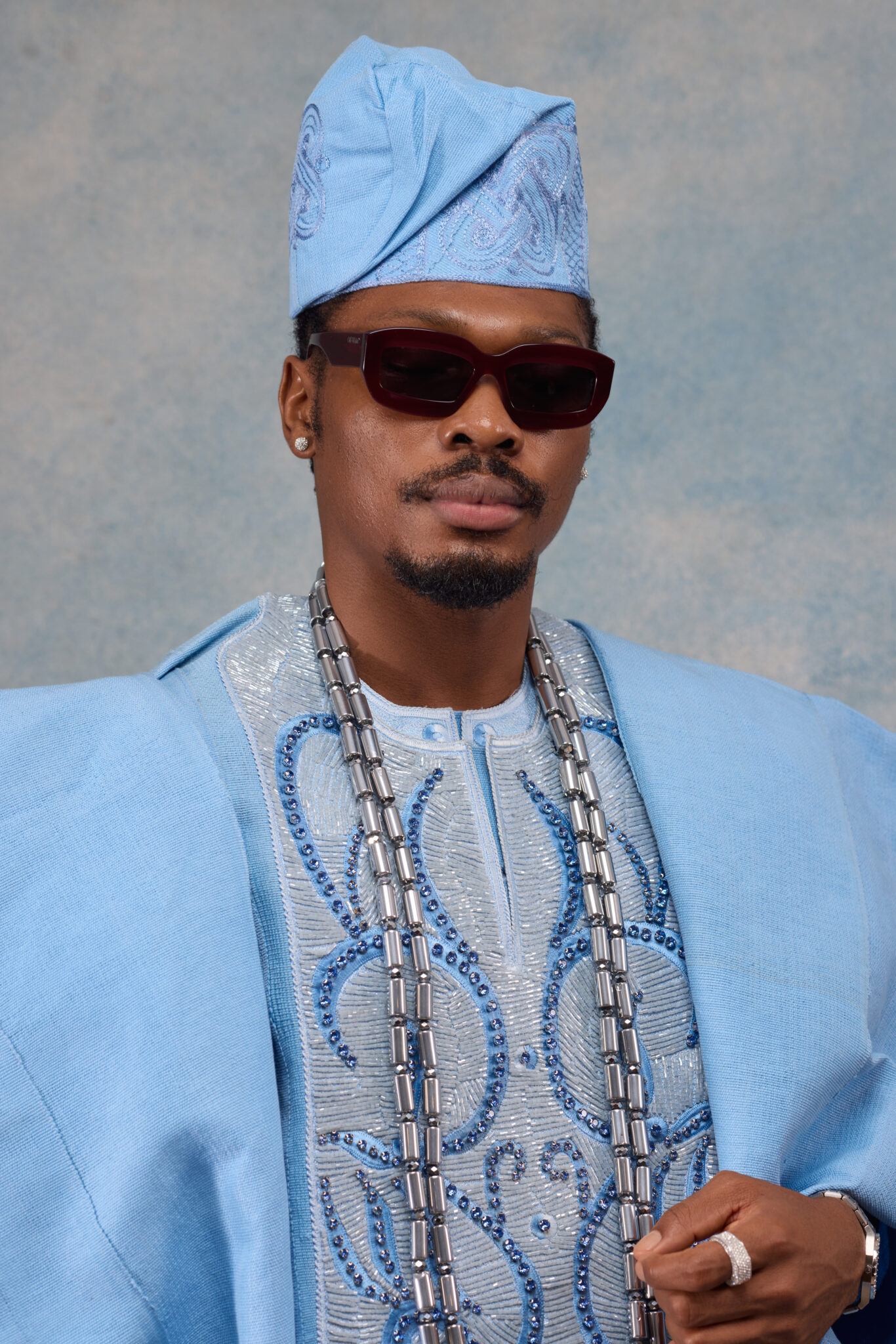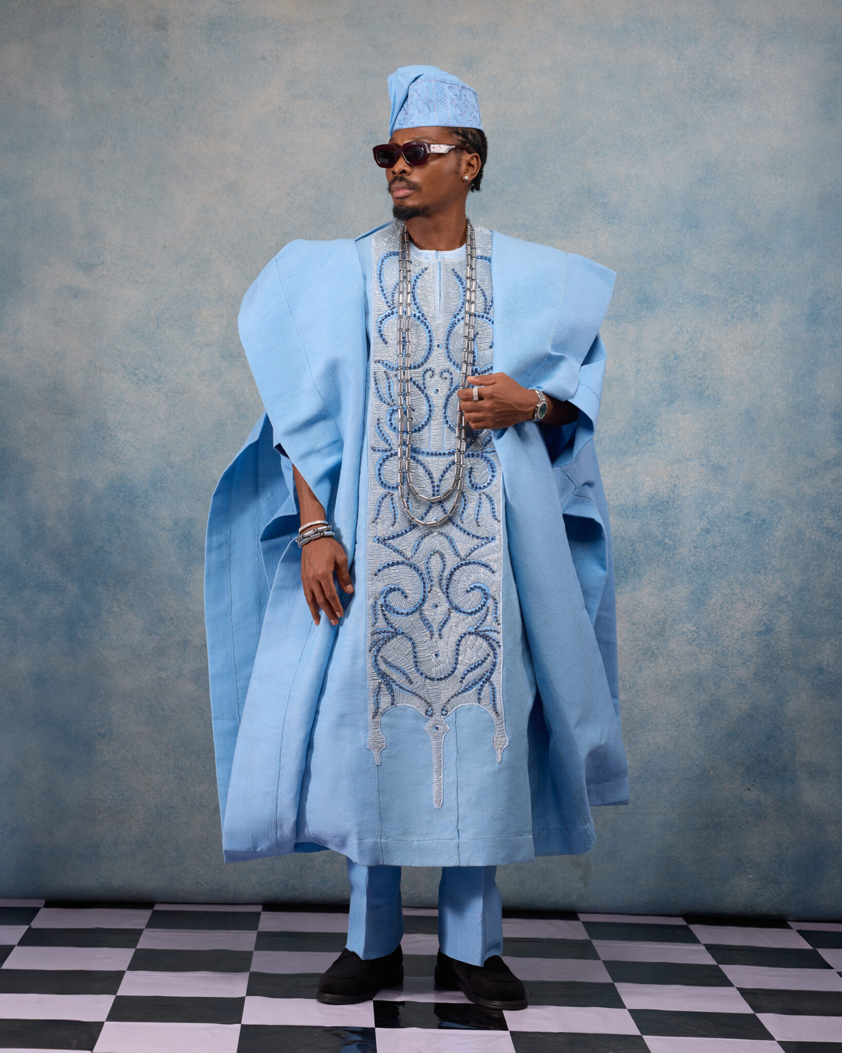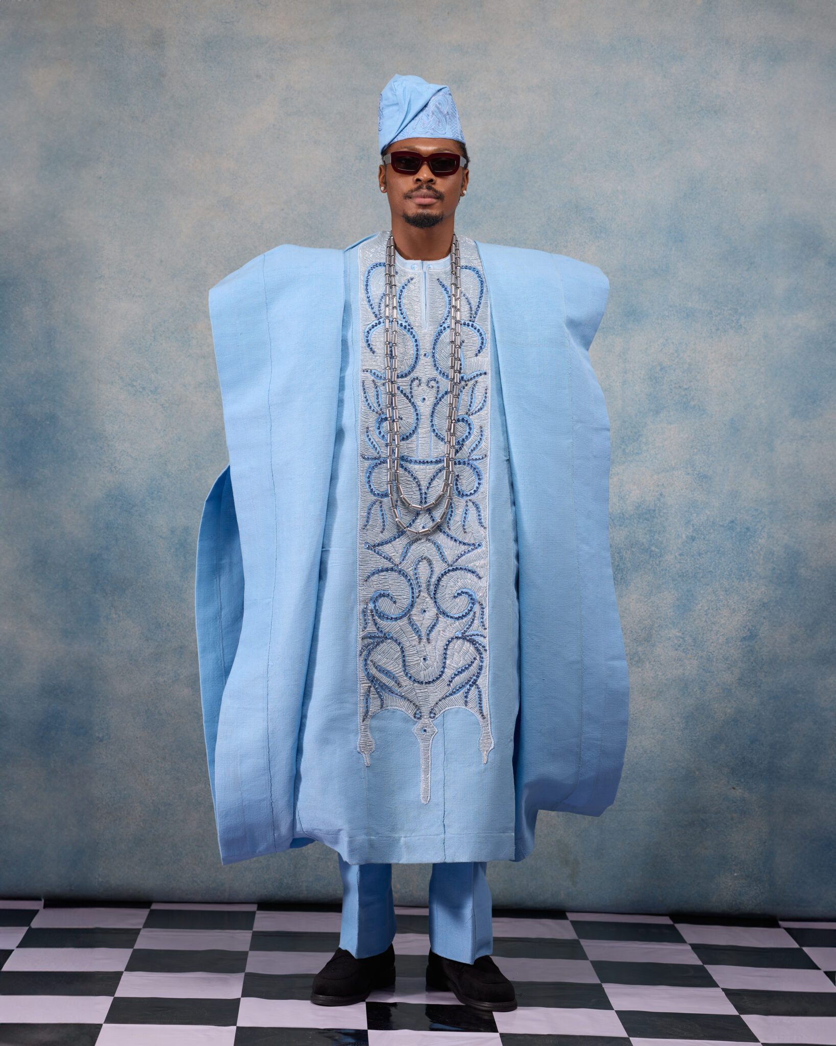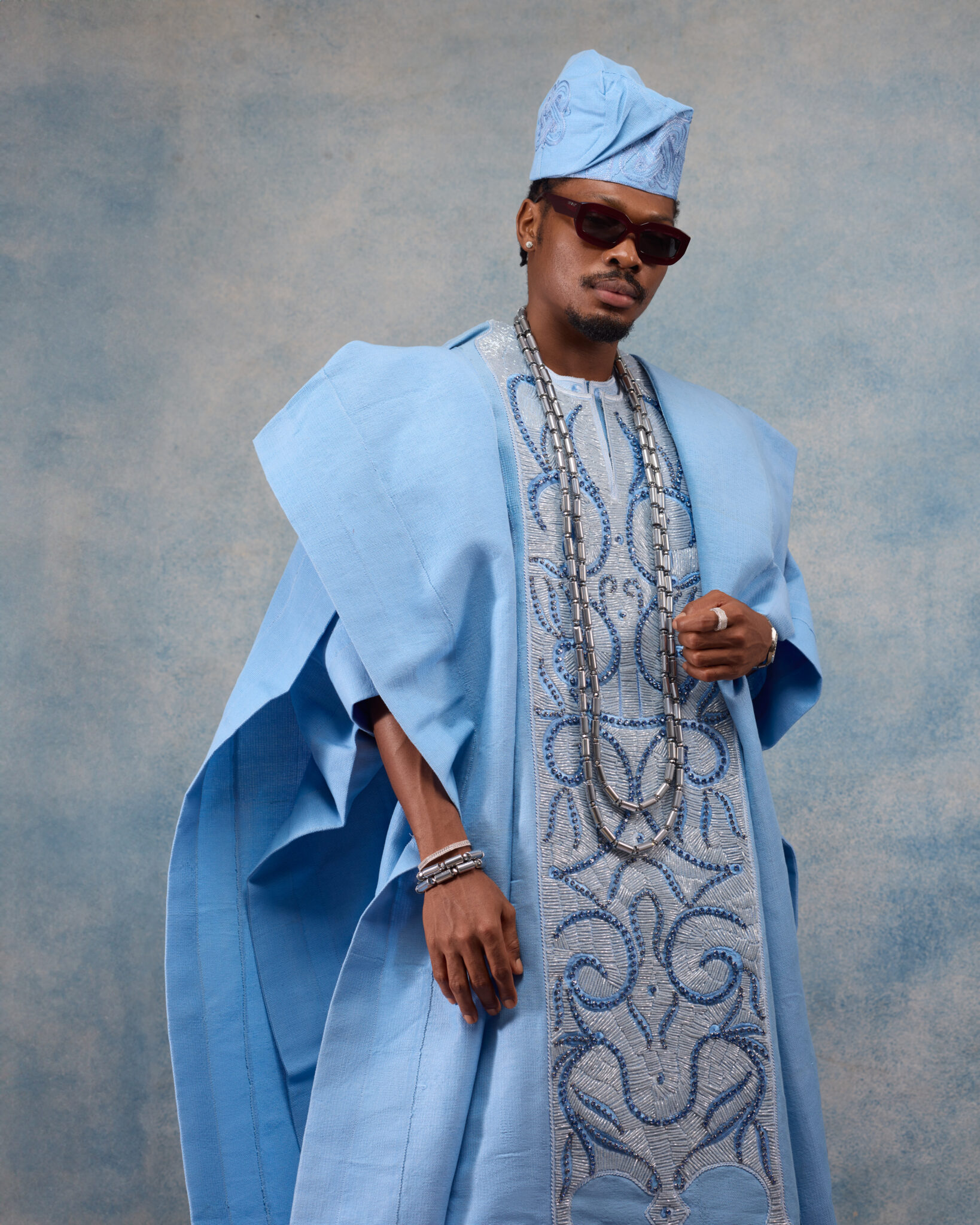 Sky blue Aso-Oke Agbada set. Sky blue embroidery, rhinestone and crushed beads detailing.