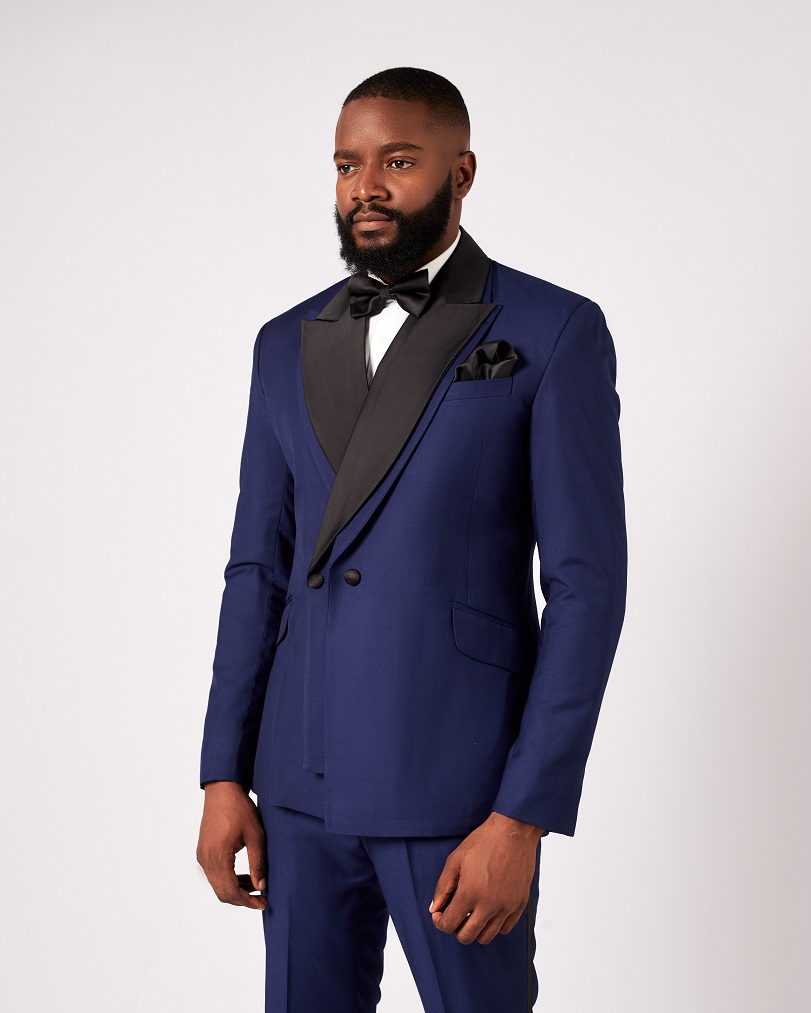 A Navy Blue Wool Peak Double-Lapel Double breasted Tuxedo Suit with tux pants Items: tuxedo jacket tux pants Other items (priced separately) Shirt bowtie Shipping policies: We ship worldwide General order processing time takes 2 to 4 weeks (a new garment is produced from scratch for each customer) Orders within Lagos: 2 to 3 weeks Interstate orders: 2 to 3 weeks International orders: 3 to 4 weeks Once ordered, you will be contacted by a representative to arrange delivery date and any other detail Customers pay the cost of shipping and custom duties Care: Dry-clean only For other items, inquiries or Urgent orders; Text/ WhatsApp/ Call: +2348122365137 Or Email: hello@ro-gue.com Web: www.rogue.ng Instagram/Tiktok/Facebook/Twitter (@rogue_ng)
