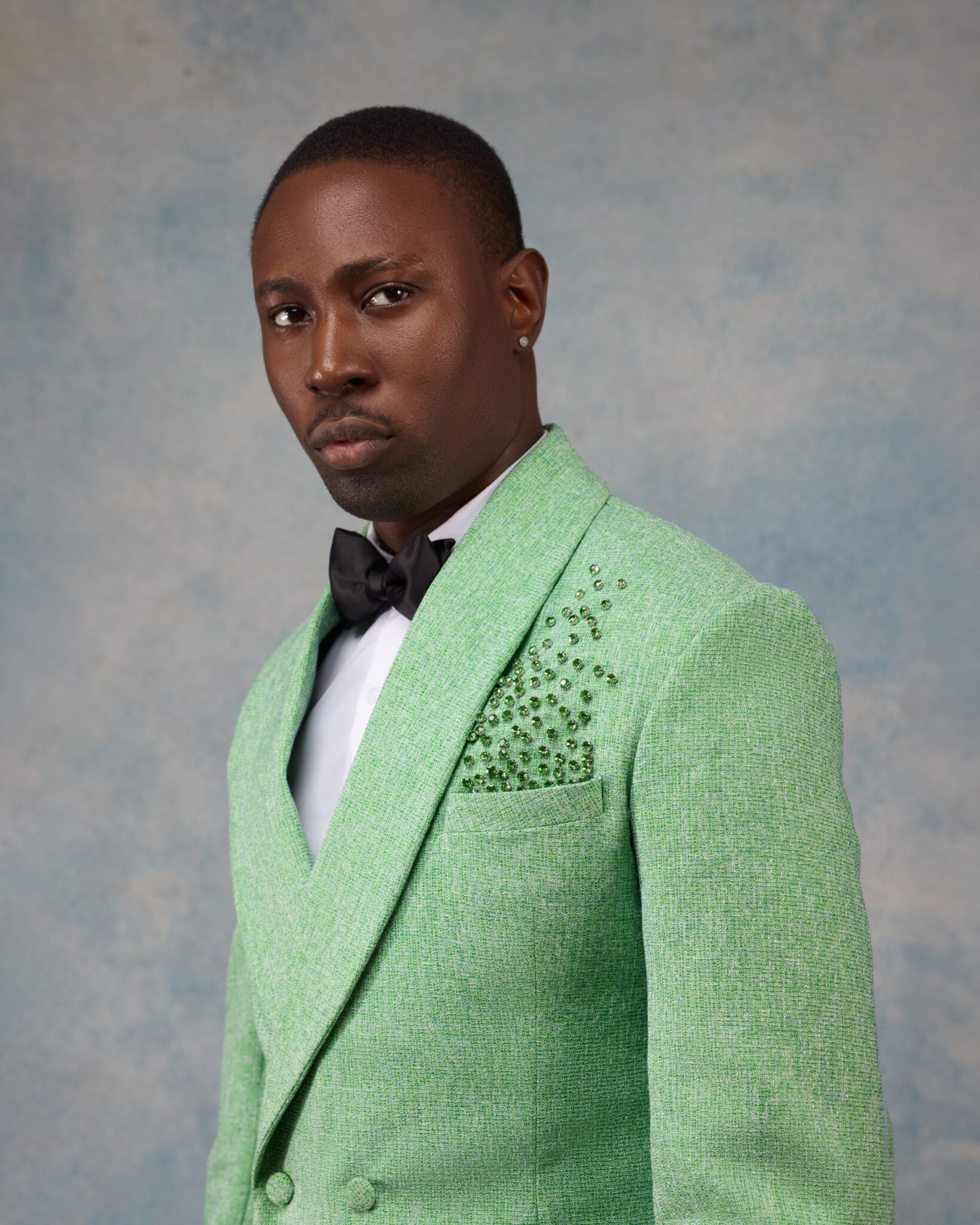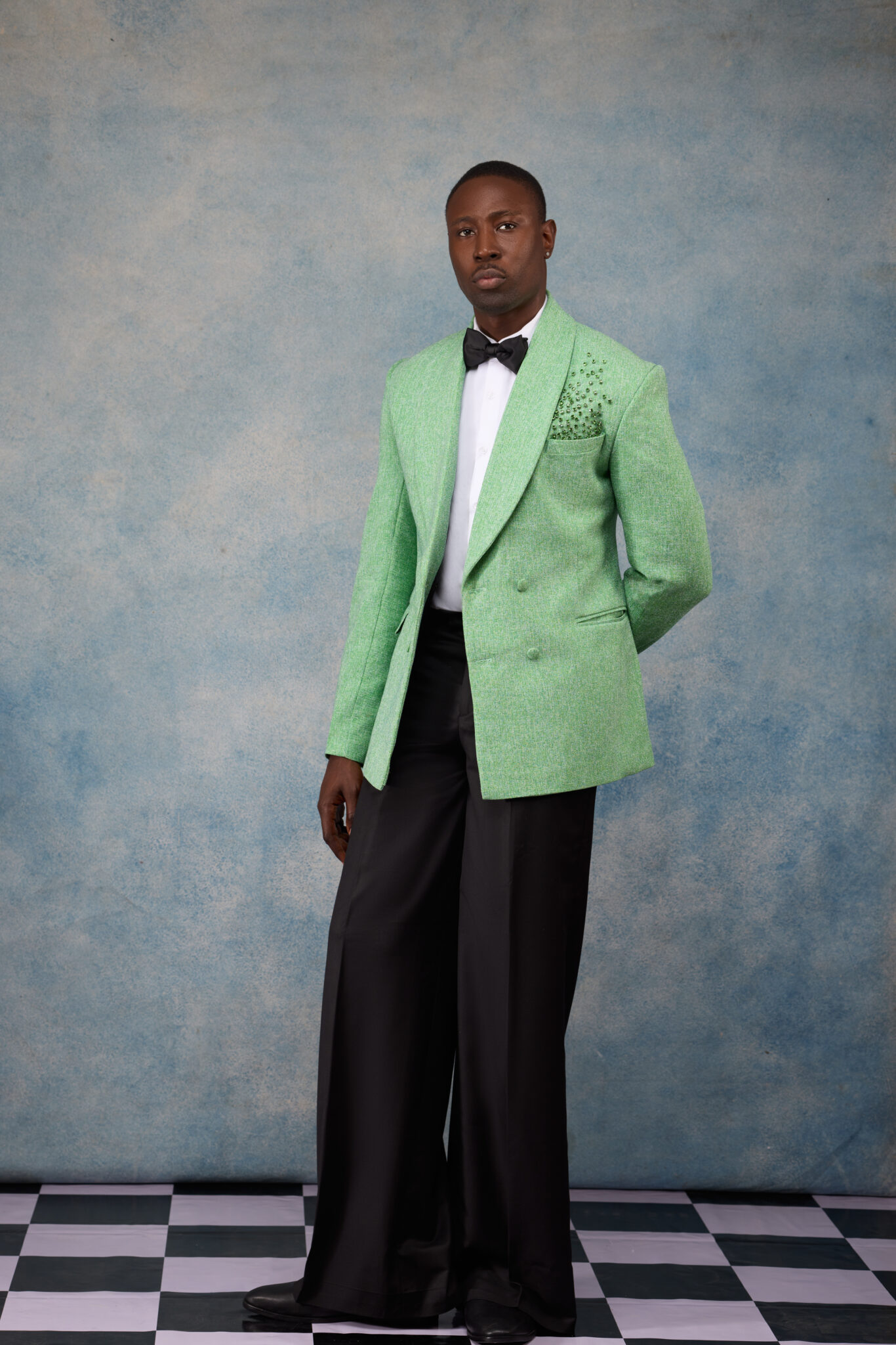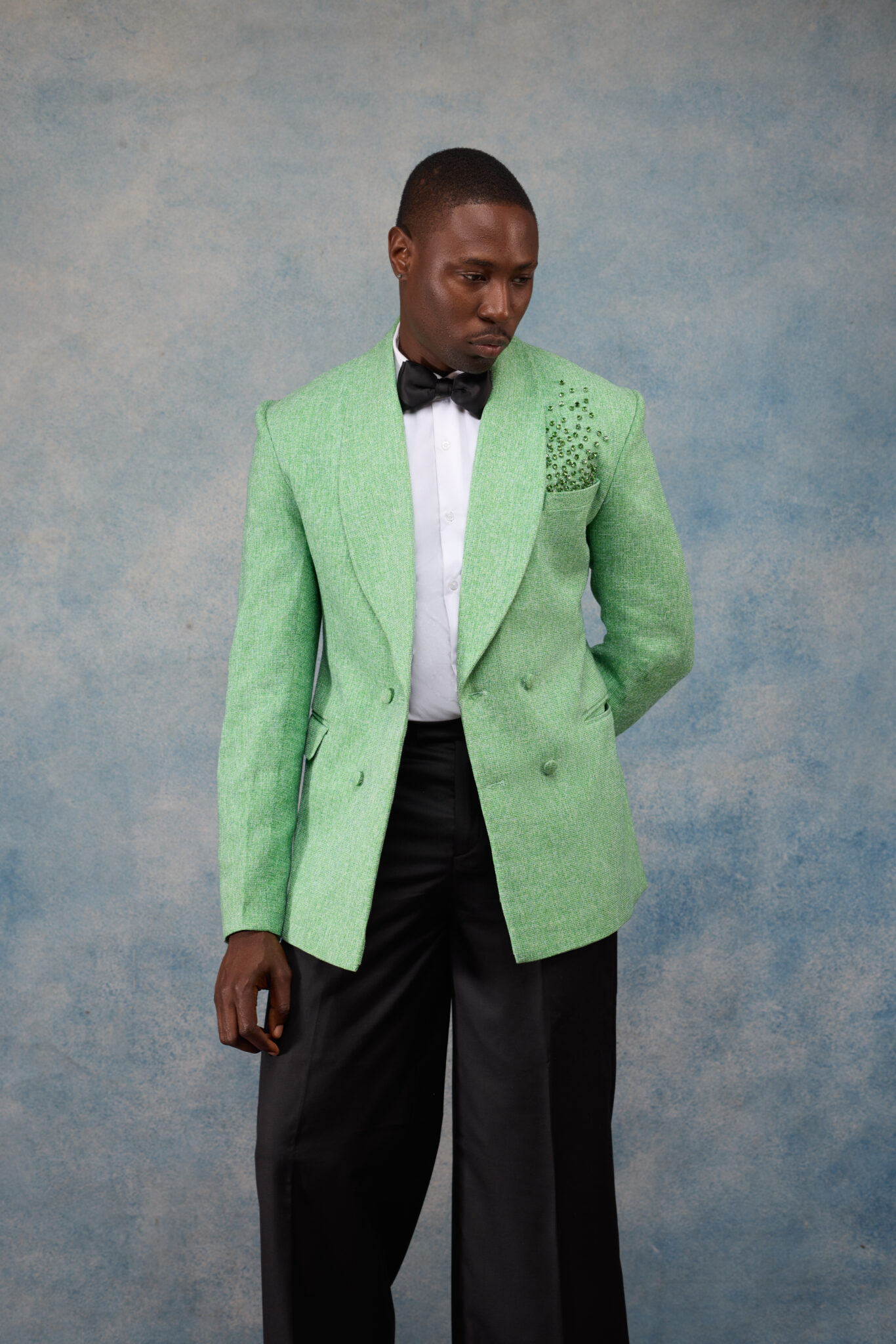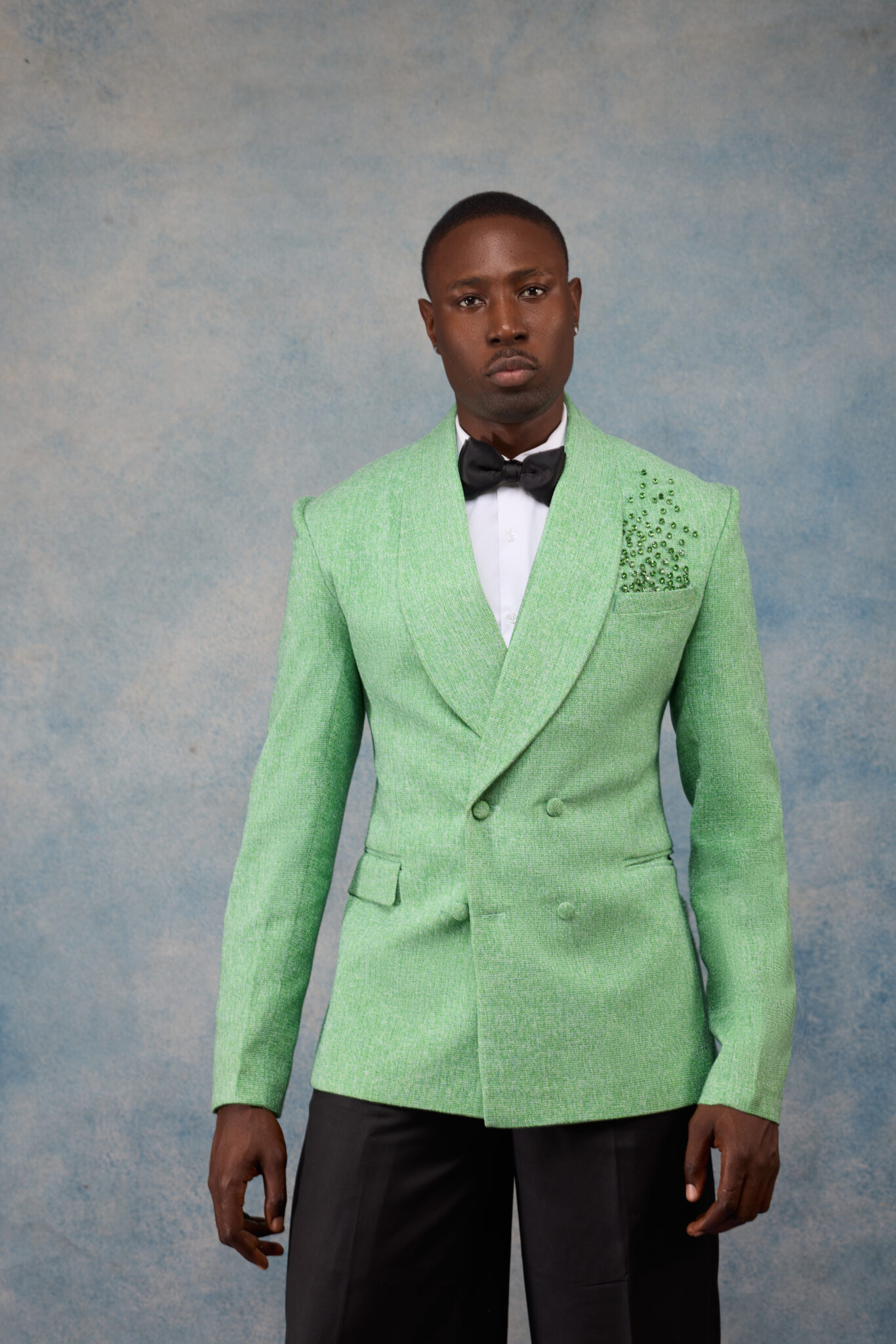 Lime green Tweed Shawl lapel Double breasted Tuxedo and Black Wool pants. Lime green rhinestone detailing.