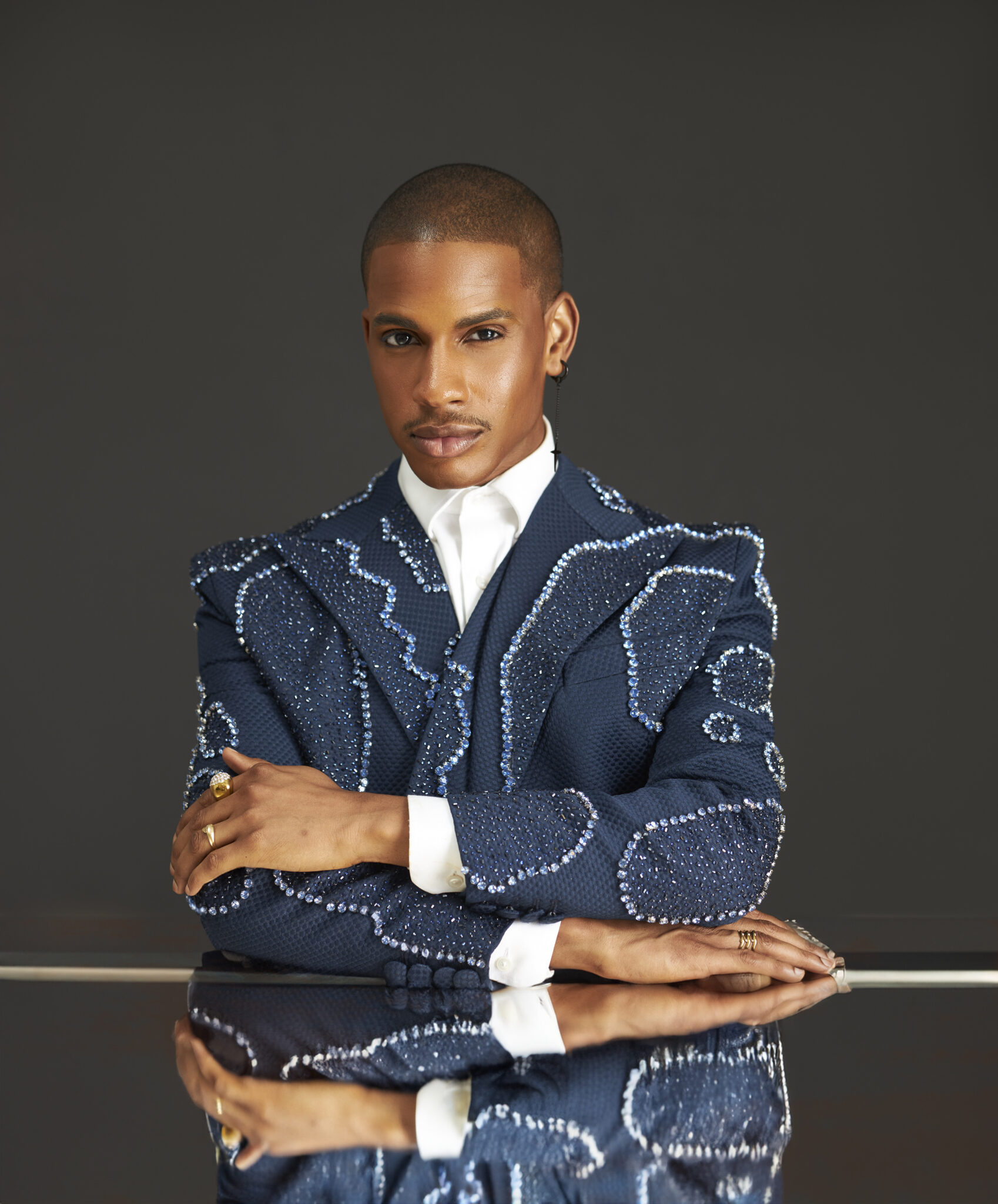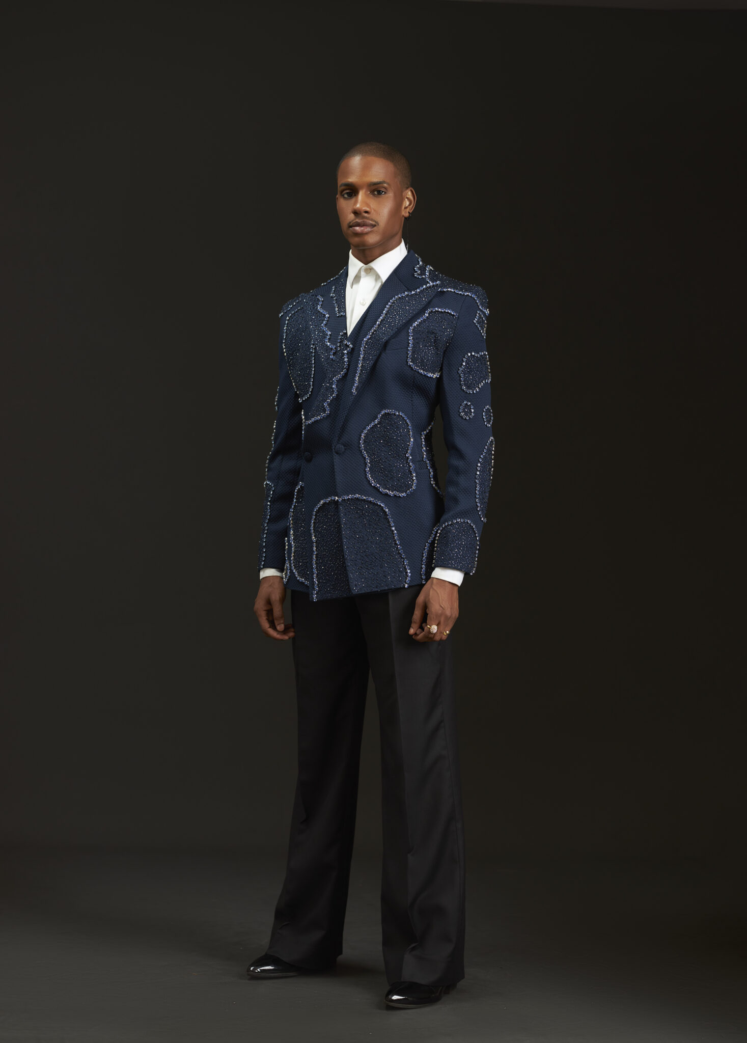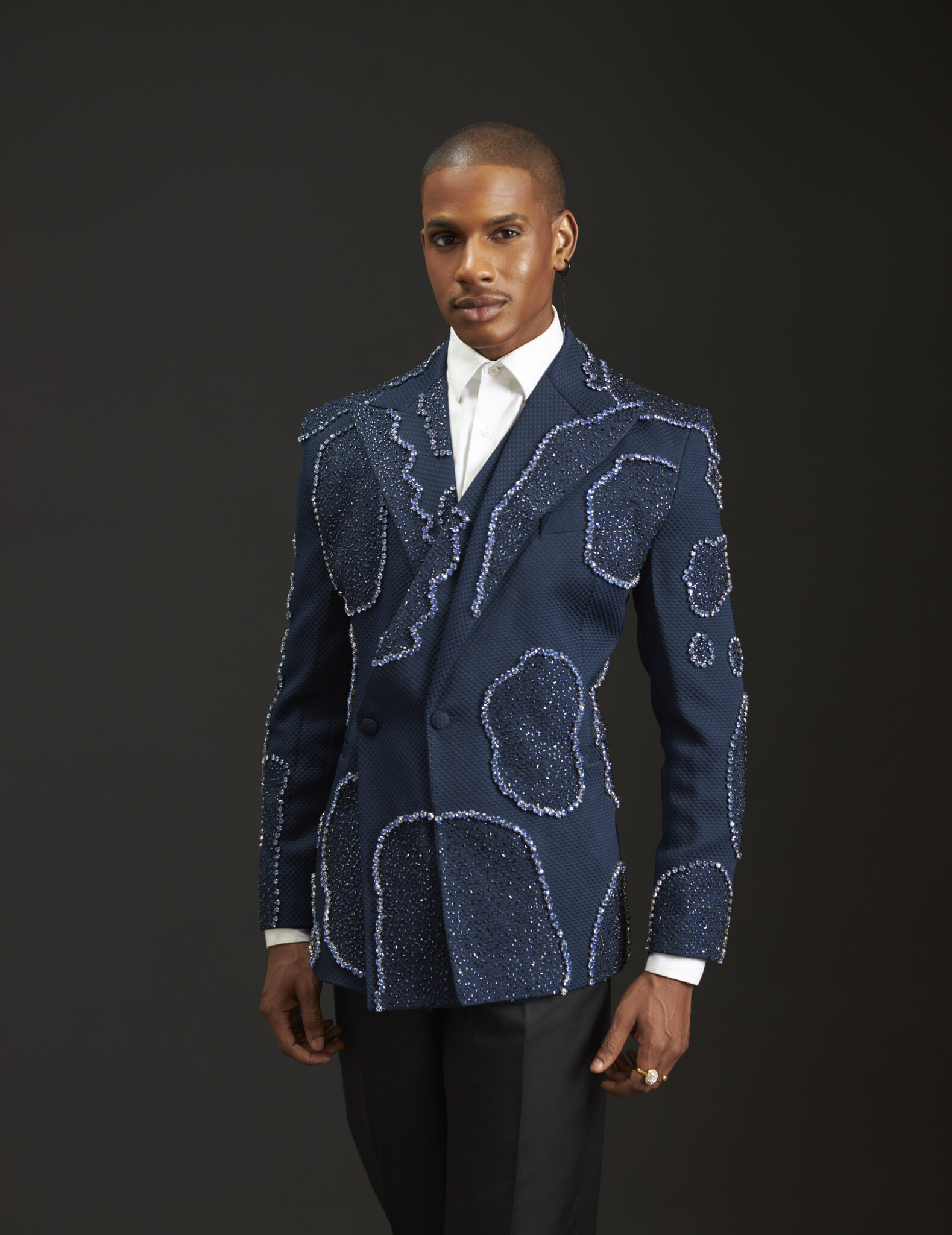 Navy blue Jacquard Peak lapel Double breasted Tuxedo and Black Wool pants. Blue and silver rhinestone detailing.