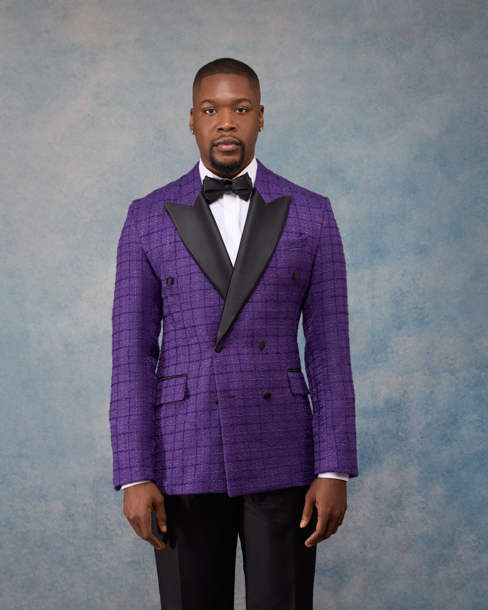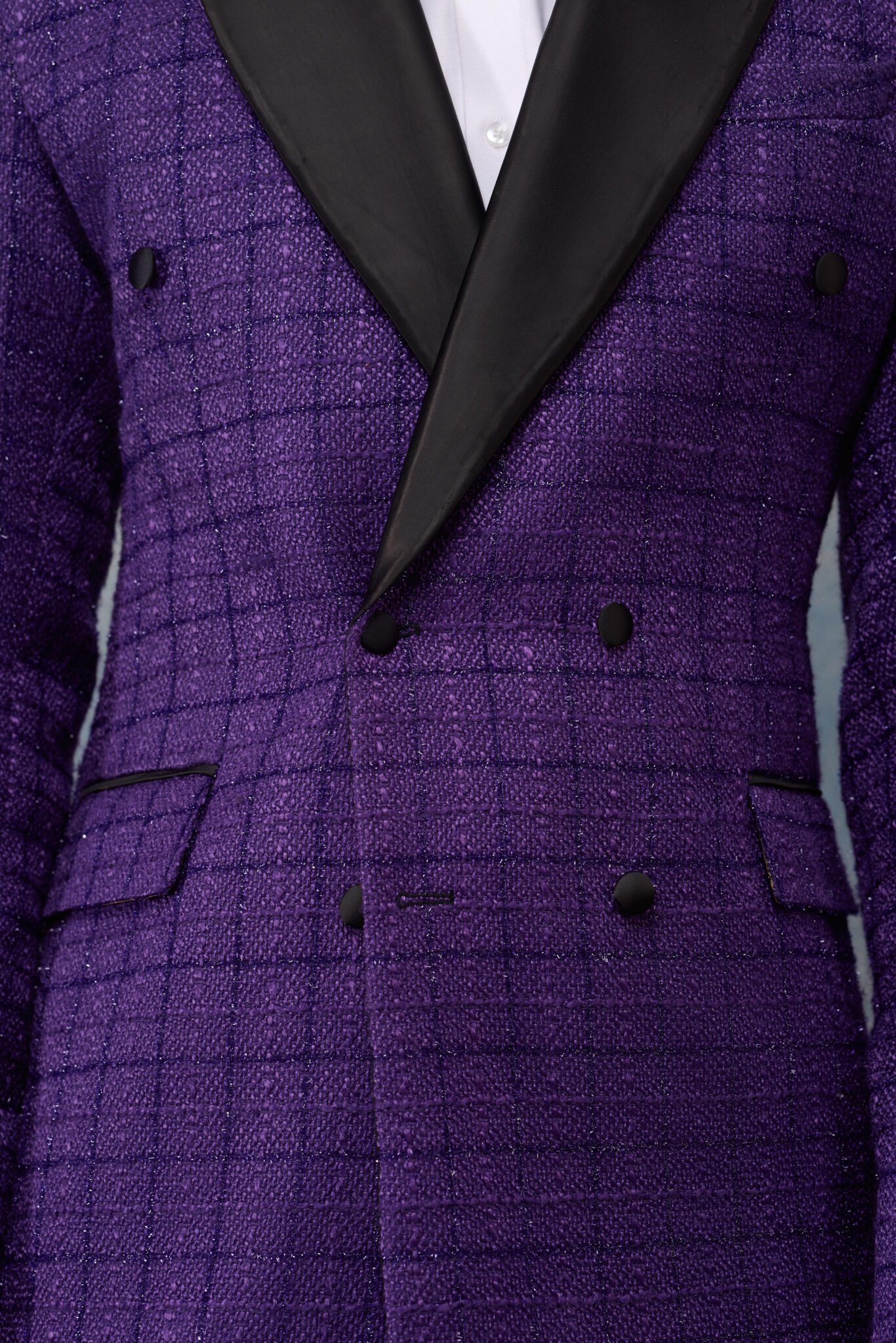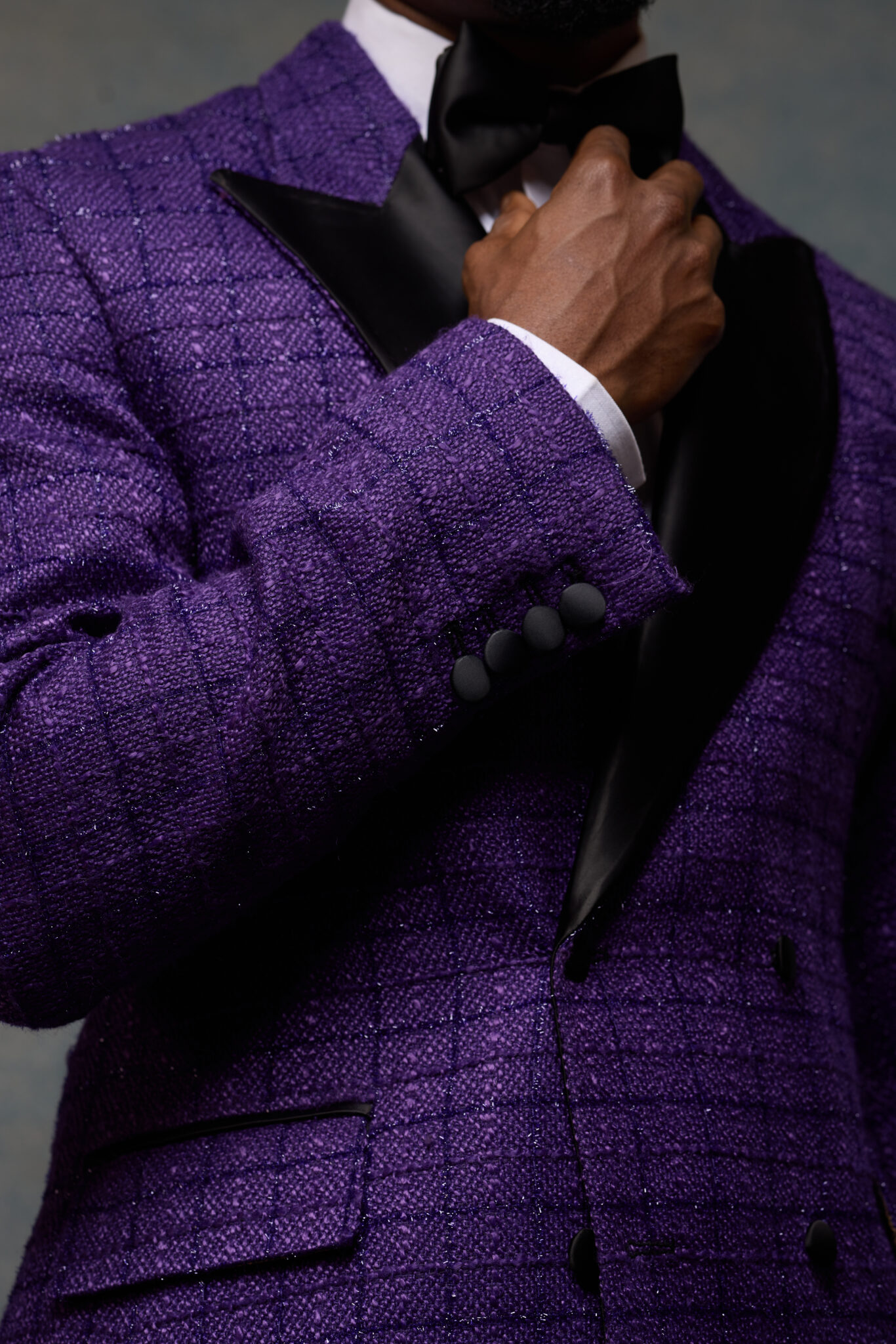 Purple tweed wool Peak lapel Double breasted Tuxedo and Black Wool pants.