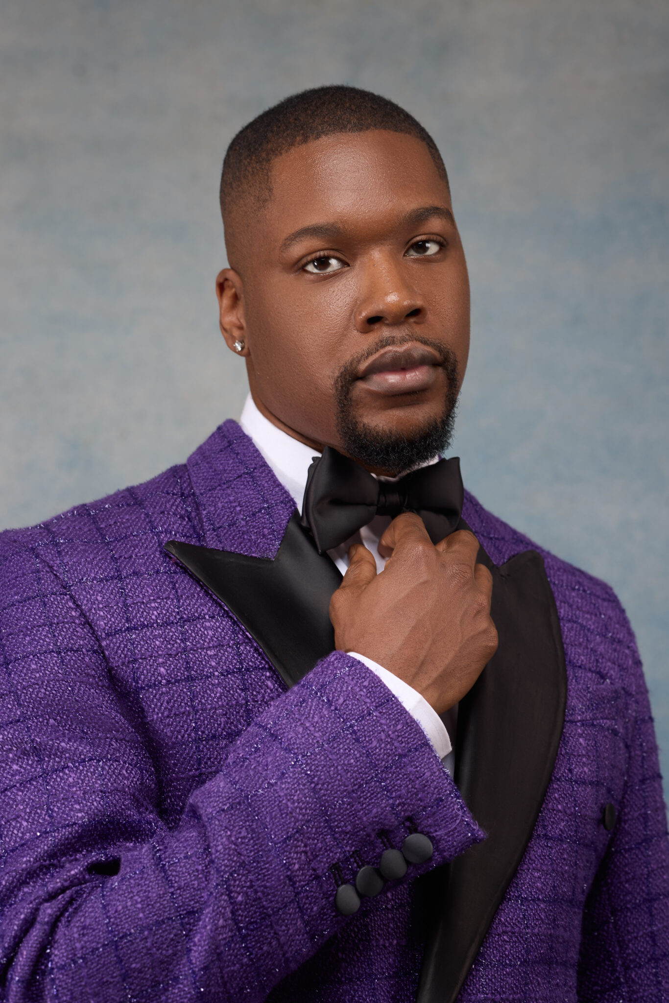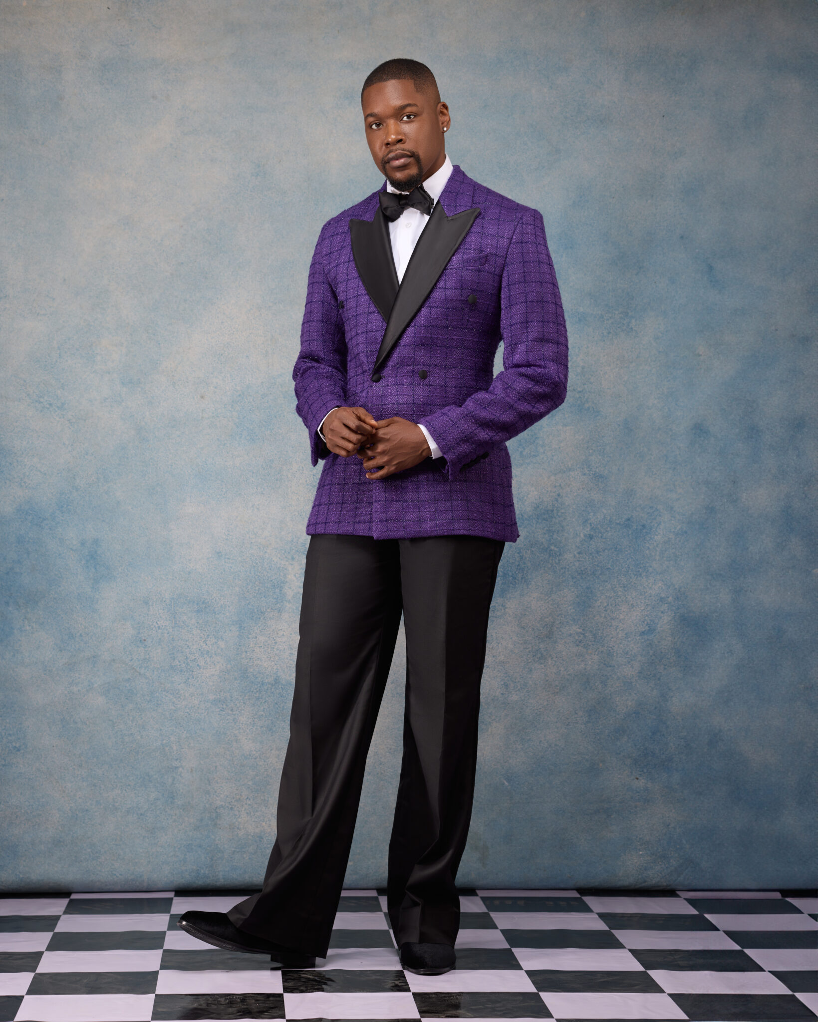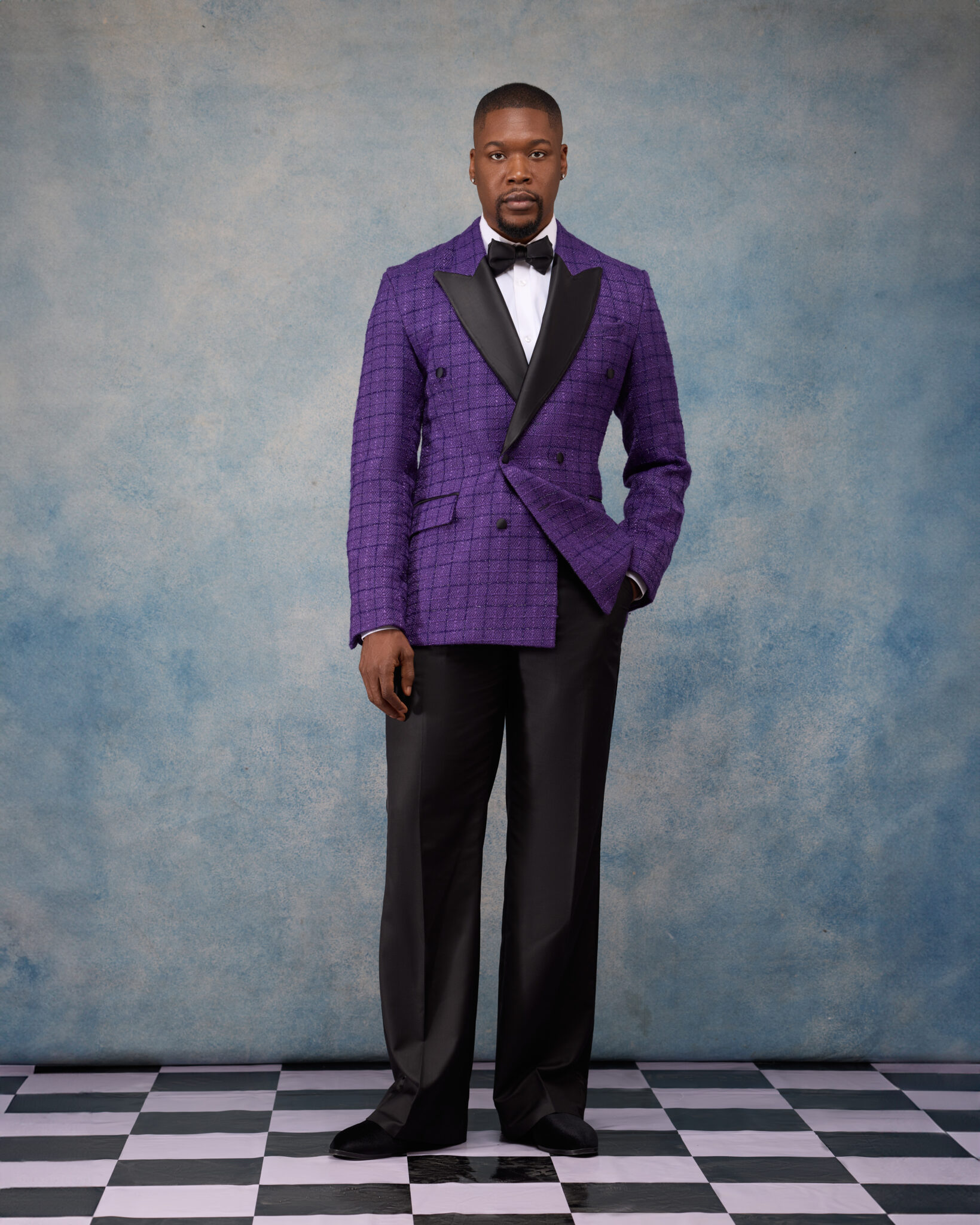 Purple tweed wool Peak lapel Double breasted Tuxedo and Black Wool pants.