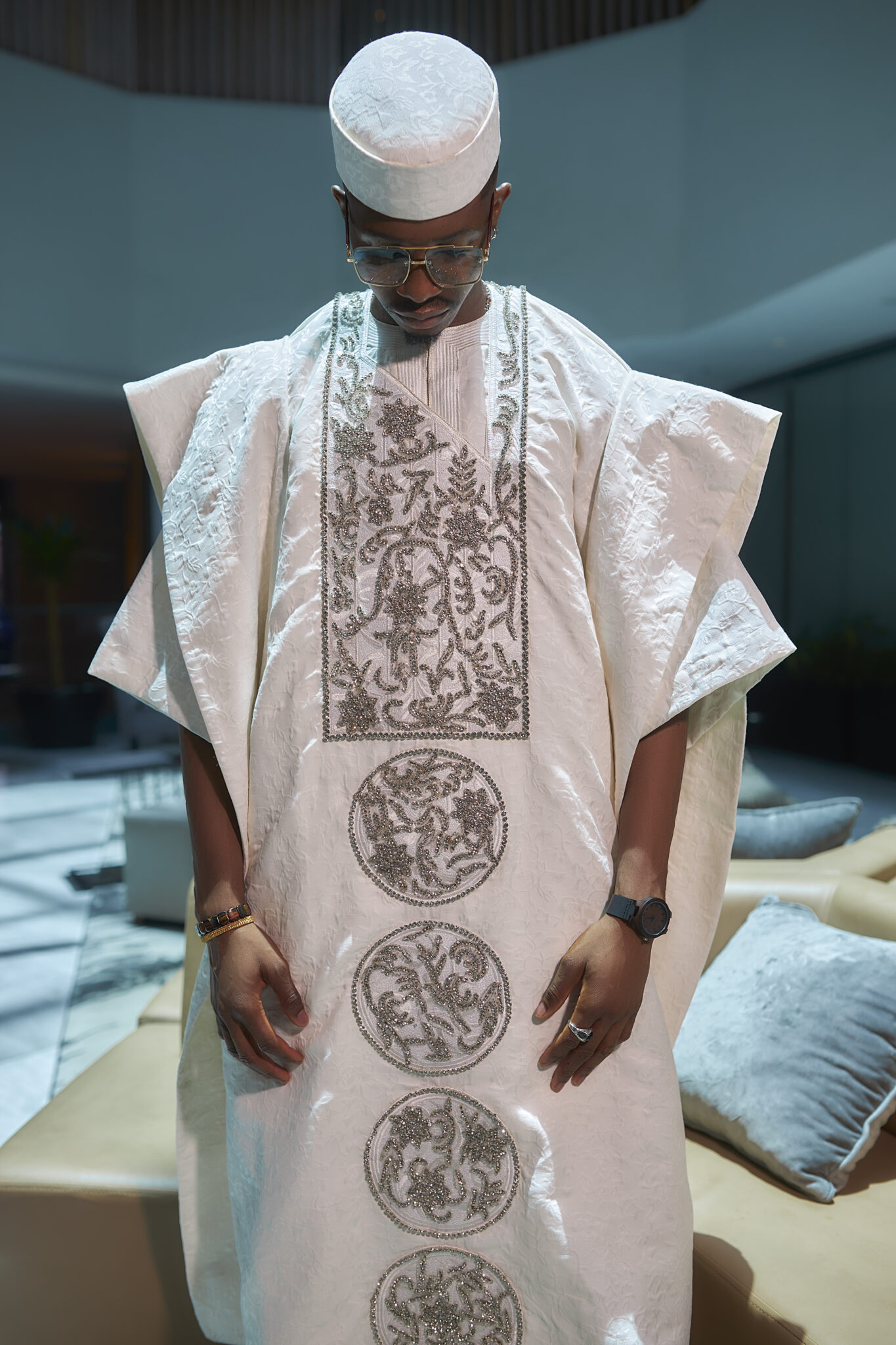 Ivory white Jacquard Agbada set. White embroidery and silver crystal detailing.