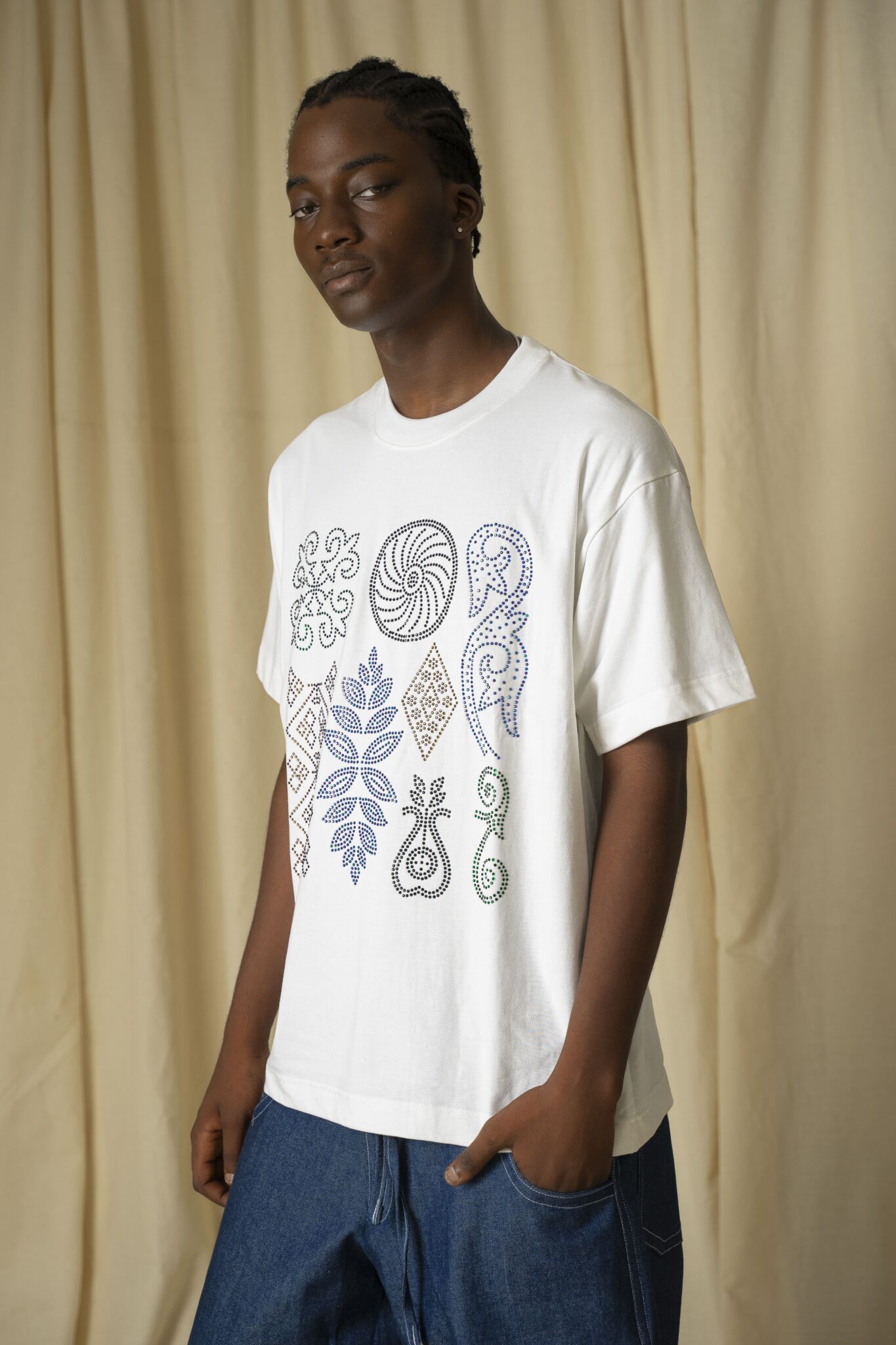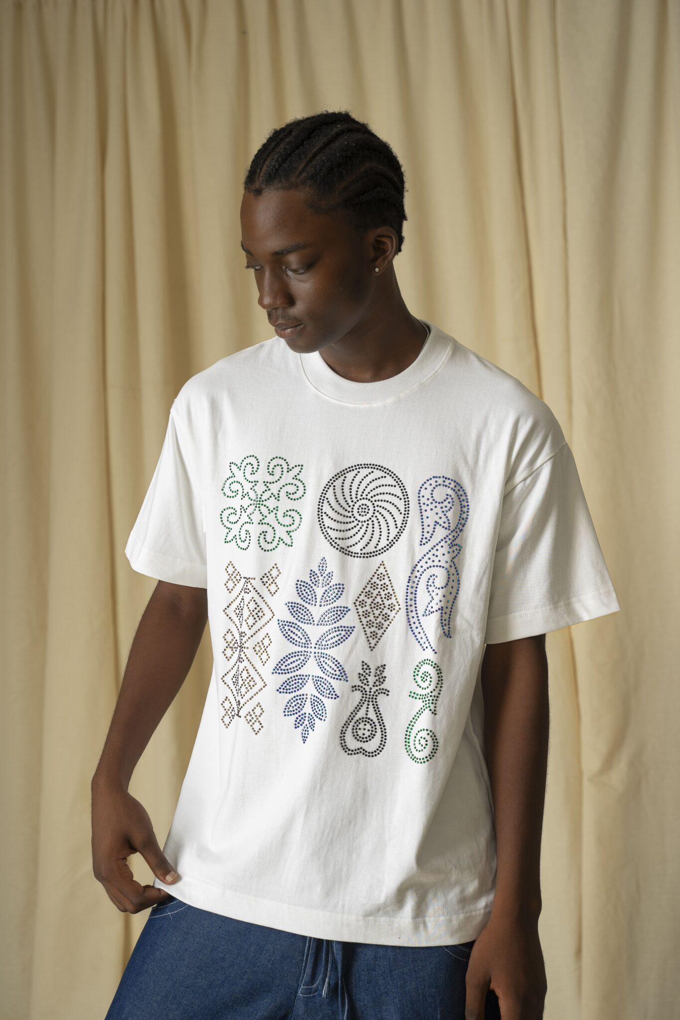 White cotton T-shirt with Afro symbols rhinestone imprint