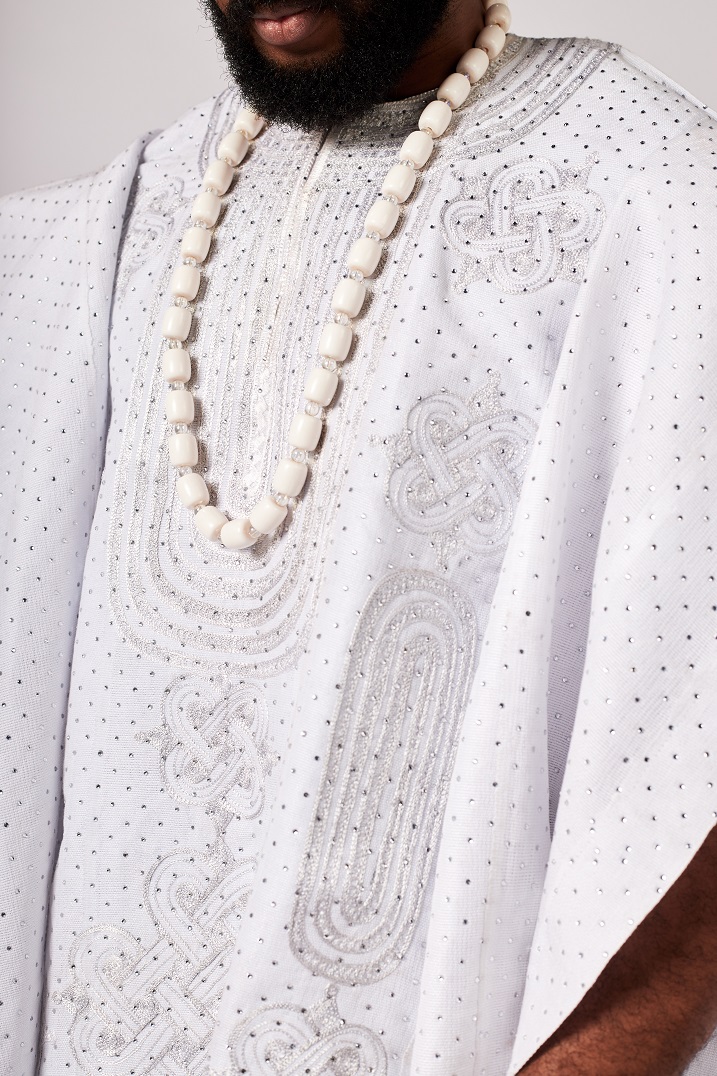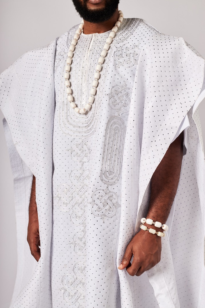 White Asooke Three-piece Agbada embellished with Rhinestones